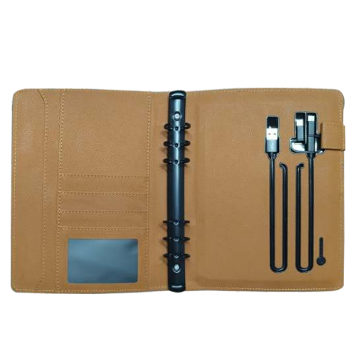 Inside, it features separate card holders, wide document pockets, and a pen loop, along with multiple charging outputs including Micro USB, Type-C & Apple connectors for universal compatibility. The power button with charging indicator adds smart funA5 Size Wireless Powerbank Folderctionality, while the illuminated logo branding space on the cover makes it an excellent high-visibility corporate gift.