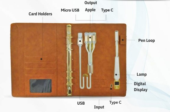 The smart interior layout includes separate card holders, wide document pockets, and a pen loop, along with a crystal beaded 16 GB pen drive for secure data storage. Multiple connectivity options—USB input, Micro USB, Type-C & Apple output—ensure universal compatibility, while the digital power display with lamp and charging indicator adds intelligent usability.