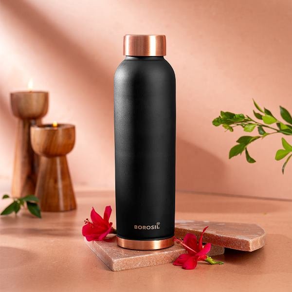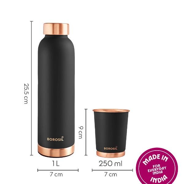 Borosil ECO Colour Copper Bottle & Glass Set – 1L Bottle with 2 Copper Glasses (Black)