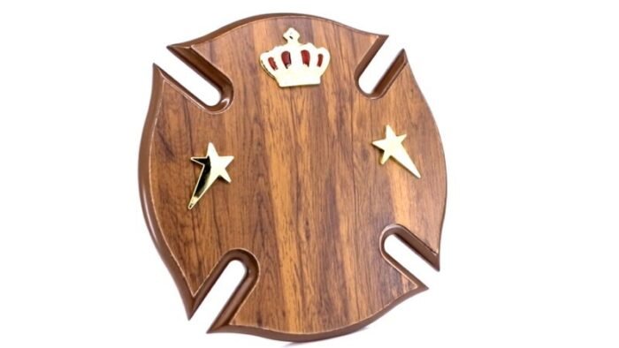 - Premium wooden shield plaque with crown and star detailing