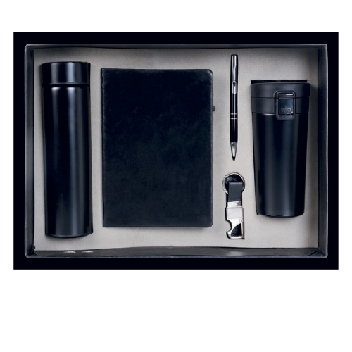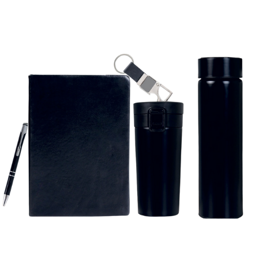 Five-in-One Executive Combo Gift Set – Premium, Practical & Corporate-Ready Create a high-impact corporate gifting moment with this sophisticated Five-in-One Combo Set, curated for modern professionals who value functionality wrapped in sleek design. The set features an A5 notebook, a metal ball pen, a metal keychain, a gym sipper bottle, and a temperature display bottle—all presented in a striking all-black executive finish. Perfect for CXO hampers, employee onboarding kits, client appreciation gifts, conference giveaways, and festive corporate campaigns, this premium combo offers excellent custom logo branding opportunities, helping businesses reinforce brand recall through everyday-use essentials.