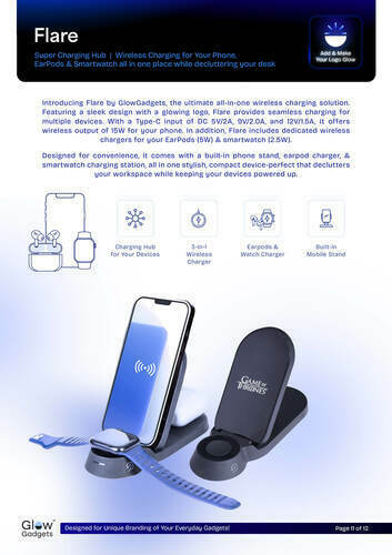 Power, style, and convenience in one. Gift the Flare Dock 3-in-1 Wireless Charger to your customers and employees—its 3-in-1 charging and illuminated logo make it a premium, practical desk companion.