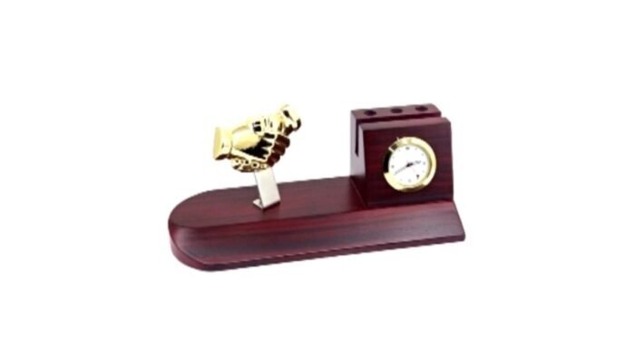 Celebrate trust, partnership, and shared success with the Golden Handshake Desk Clock, a refined desk accessory crafted on a polished wooden base and highlighted by a striking golden handshake sculpture. Accented with a motivational quote, this clock is designed to honour leadership excellence and meaningful corporate milestones.