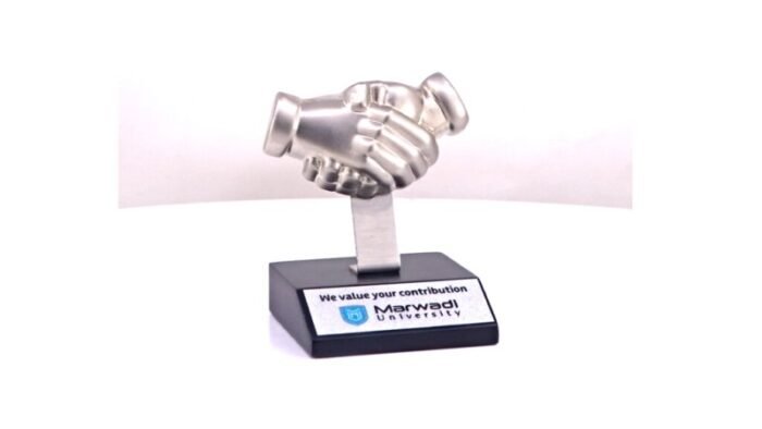 - Chrome-finished handshake sculpture symbolising trust and collaboration