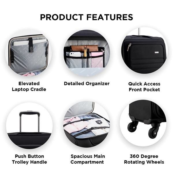 Constructed from EVA-fused 500D polyester, this lightweight yet durable cabin luggage is reinforced with protective corner guards for added impact resistance. The spacious interior accommodates travel essentials and includes a dedicated compartment suitable for laptops up to 15.6 inches, along with a detailed organizer to keep items neatly arranged and easily accessible.