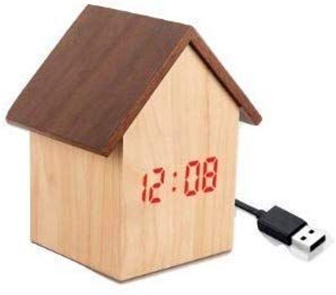 Hut-Shaped Wooden LED Clock with Temperature & Sound Sensor – Dual Power