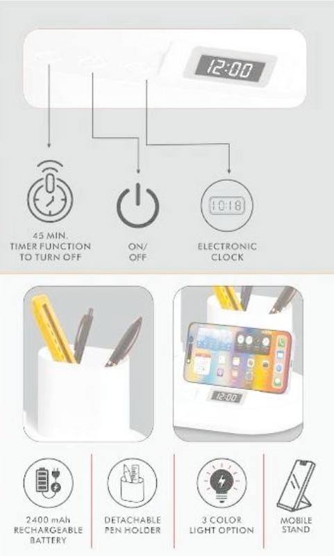enZen Time: Multifunctional Rechargeable LED Desk Lamp with Clock, Pen Stand & Phone Holder – 3-Color Light, Adjustable Brightness, Type-C Charging