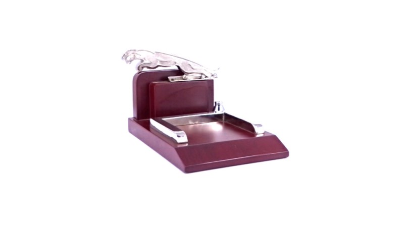 Showcase strength, elegance, and sophistication with the Power & Prestige Desk Stand. Featuring a metallic jaguar figurine with sleek silver accents on a rich wooden base, this desk accessory combines luxury with functionality.