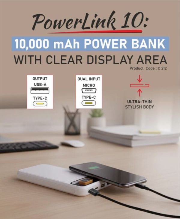 Stay powered wherever you go with the PowerLink 10 Power Bank, featuring a 10,000 mAh high-capacity battery that delivers long-lasting backup for smartphones, tablets, Bluetooth gadgets, and more. Its clear digital display lets you monitor battery and charging status in real time, so you’re always in control.