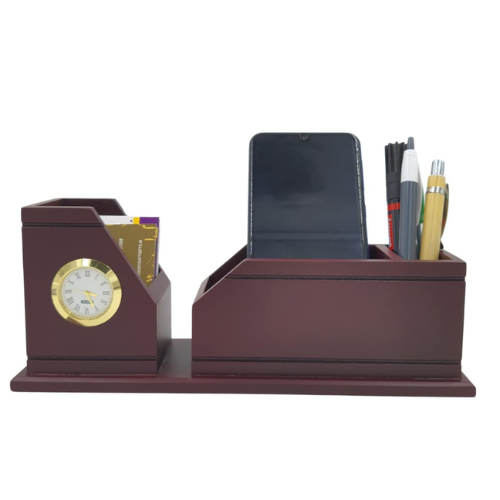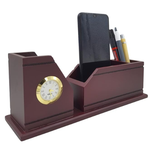 Premium Corporate Desk Organizer with Clock – Smart, Stylish & Brand-Forward. Enhance executive workspaces with this elegant Corporate Desk Organizer & Clock Set, designed to combine everyday functionality with powerful brand presence. Featuring a built-in analog clock, mobile stand, and pen holder, this compact desktop accessory keeps essentials neatly arranged while elevating office aesthetics. Crafted for modern professionals, it’s perfect for reception desks, CXO cabins, conference rooms, and home offices. The bold front-facing branding panel ensures maximum logo visibility—making it an ideal choice for corporate gifting, employee recognition programs, dealer meets, festive campaigns, and promotional merchandise. With its premium finish and thoughtful layout, this desk organizer delivers daily utility and long-term brand recall in one powerful gifting solution.