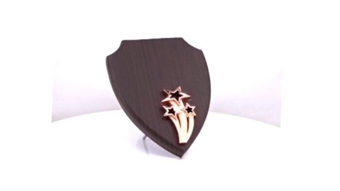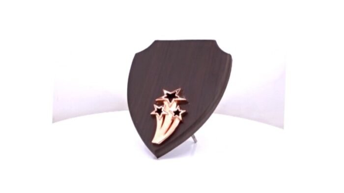 The Shield Plaque is a striking corporate recognition award designed to honour creativity, training excellence, and special project achievements. Crafted in a unique shield shape, this plaque features a rich, deep walnut wood finish complemented by elegant copper star accents, creating a bold yet refined visual appeal.