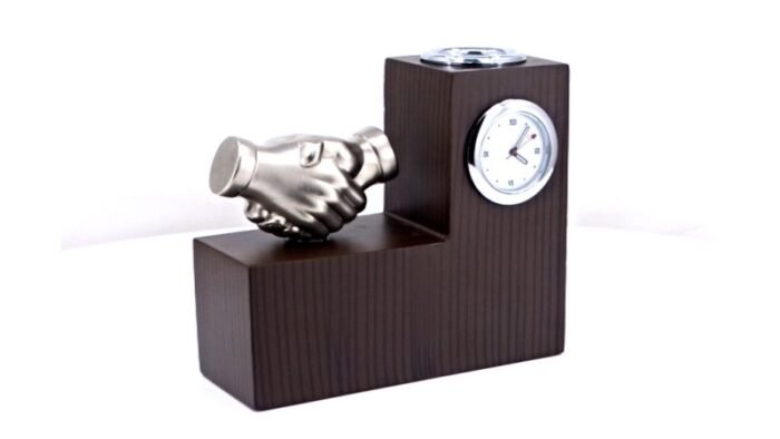 Celebrate partnership, trust, and professionalism with the Silver Handshake Pen Stand With Clock, a premium desk accessory that blends elegance and functionality. Featuring a detailed silver handshake sculpture paired with a working clock and pen holder, this piece is ideal for executive desks, boardrooms, and corporate gifting.