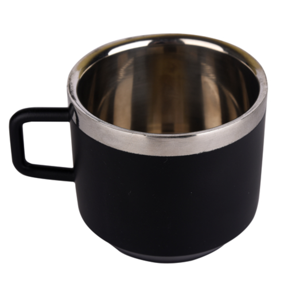 An unbreakable and odourless multipurpose cup which can be used to serve tea, coffee, and milk. The unique style of the steel Cup is a double-wall cup ( Black Matte Finished Stainless Steel Cup -120ml ) made of non-magnetic stainless steel with an elegant look and a comfortable handle. The surface of the cup comes in matte powder coating, and the sweat-free design makes it easy to grip and gently fits into your hand. This Black Stainless Cup is lightweight and easy to carry. It is ideal for gifting and travelling.