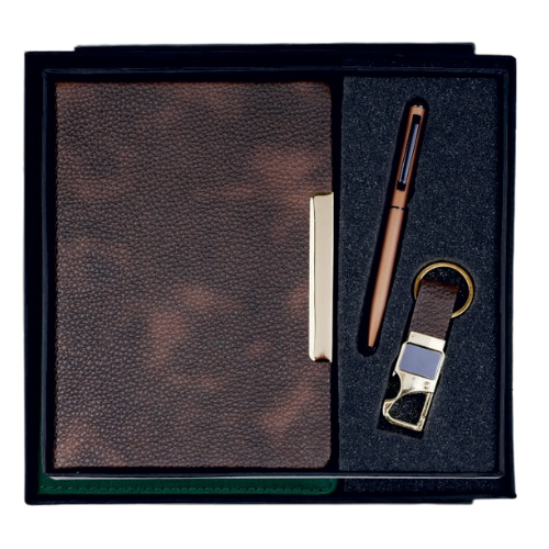 Three-in-One Brown Executive Combo Gift Set – Classic, Practical & Corporate-Ready Strengthen your corporate gifting portfolio with this refined Three-in-One Combo Set in Brown, featuring a PU A5 notebook, a matching metal ball pen, and a metal keychain—all curated in a timeless earthy finish that appeals to modern professionals. Perfect for employee onboarding kits, client appreciation gifts, dealer incentives, conference giveaways, and festive corporate campaigns, this combo delivers everyday utility with a premium touch. With ample scope for custom logo branding, it becomes a high-ROI merchandising tool for brand recall at scale.