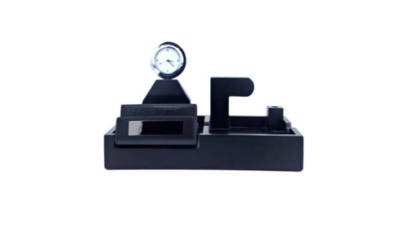 The Time, Order & Elegance desk accessory is a sophisticated all-in-one executive desk organizer designed for professionals who value precision, structure, and style. Finished in a sleek black tone, this refined desk piece integrates a clock, watch stand, memo pad space, and card holder, offering both elegance and everyday functionality.