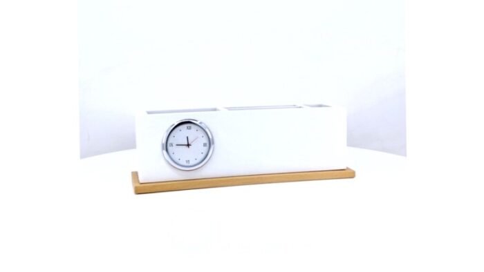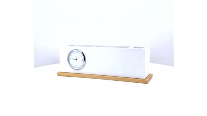 White Elegance Desk Organiser – Stylish Desk Accessory with Clock and Branding Plate