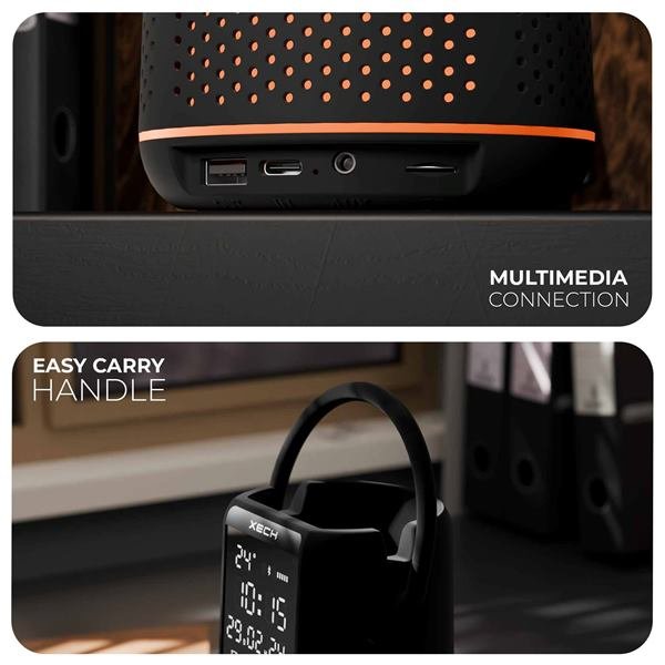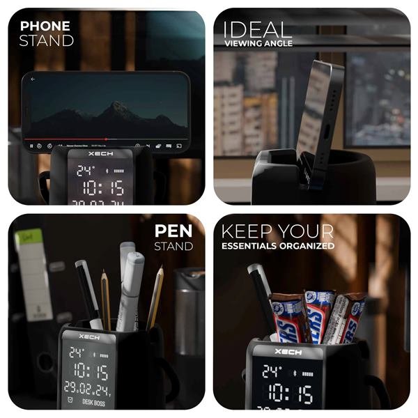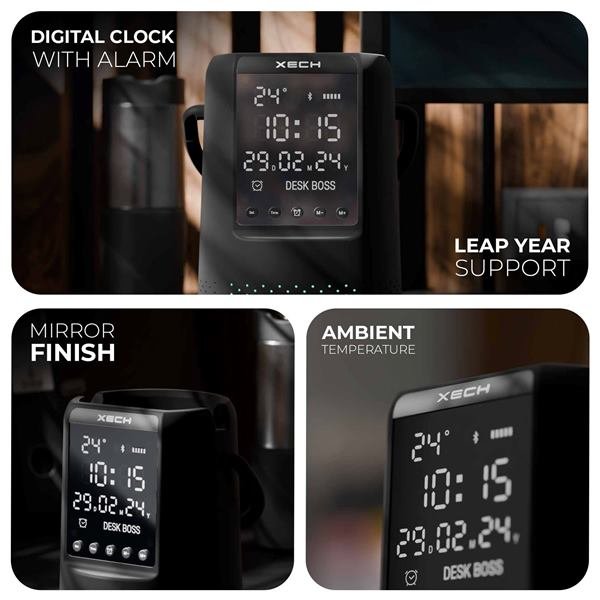 Upgrade your workspace with the Xech Deskboss Dark Edition, a premium multifunctional desk companion designed to help you master multitasking. Encased in a sleek dark rubber finish, Deskboss seamlessly combines a digital mirror clock, 10W high-fidelity Bluetooth speaker, RGB ambient lighting, and desk organiser into one powerful device.